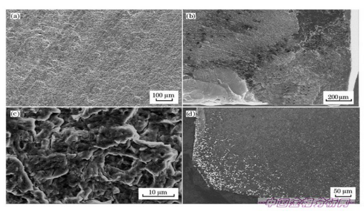 • 断口1在扫描电镜下显示疲劳弧线[图4(a)];根据弧线的走向可以找到疲劳源,疲劳源在[图4(d)]右上方拐角处,局部放大,源区的细微组织大部分已磨损,但能看到放射棱特征[图4(b)];在疲劳扩展区可见疲劳条纹及二次裂纹[图4(c)];断口2未见疲劳条纹,只有韧窝,可见断口1是最先开始断裂的断口,而断口2是二次断口。